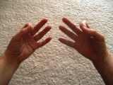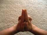 Hand-Mudra: Verschränke die Finger ineinander und lege die ausgestreckten Zeigefinger aneinander. Halte die Hand so hoch, das die Zeigefinger-Spitzen auf Höhe des Ajna-Chakras sind.