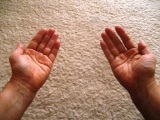 • Finger-Mudra: Gib Zeigefinger und Daumen jeder Hand zusammen, und lege die Hände mit dem Handteller nach oben (Chin-Mudra) oder nach unten (Ghyana-Mudra) auf deine Knie.