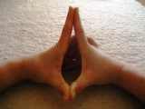 • Hand-MudraYoni-Mudra: Lege die gestreckten Zeigefinger und Daumen so aneinander, dass sie sich auf ganzer Länge berühren und gleichzeitig verschränke die restlichen Finger ineinander. Lege die so geformten Hände knapp oberhalb deines Schambeins an deine Körpervorderseite. Die Zeigefinger zeigen dabei zum Boden vor dir, die Daumen weisen Richtung Bauchnabel.